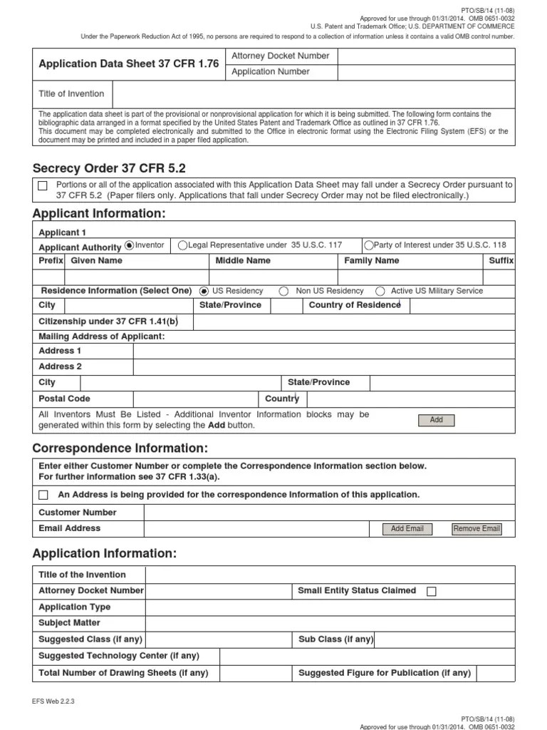 Application Data Sheet 37 Cfr 1.76 - Web an application data sheet is a sheet or sheets that may be submitted in a provisional application under 35 u.s.c. An application data sheet must contain all of the section. Web an application data sheet must be titled “application data sheet.”. >>>application data sheet (37 cfr 1.76) (version 2.2.13,.