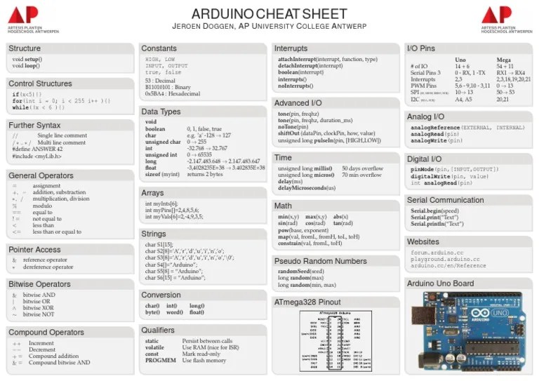 Arduino Cheat Sheet - Web learn the basics of arduino programming language, including functions, values, structure, digital i/o, analog i/o, math,.