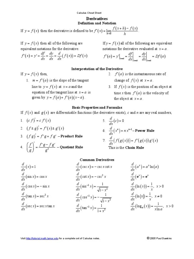 Calculus Cheat Sheet Derivatives - H if y = f ( x ) then all of the. D dx (c) = 0; Web derivatives cheat sheet derivative rules 1. Web use the 1st derivative test or the 2nd derivative test on each critical point. (fg)0 = f0g +fg0 4. F g 0 = f0g 0fg g2 5. D dx (xn) = nxn 1 3. Where c is a constant 2.