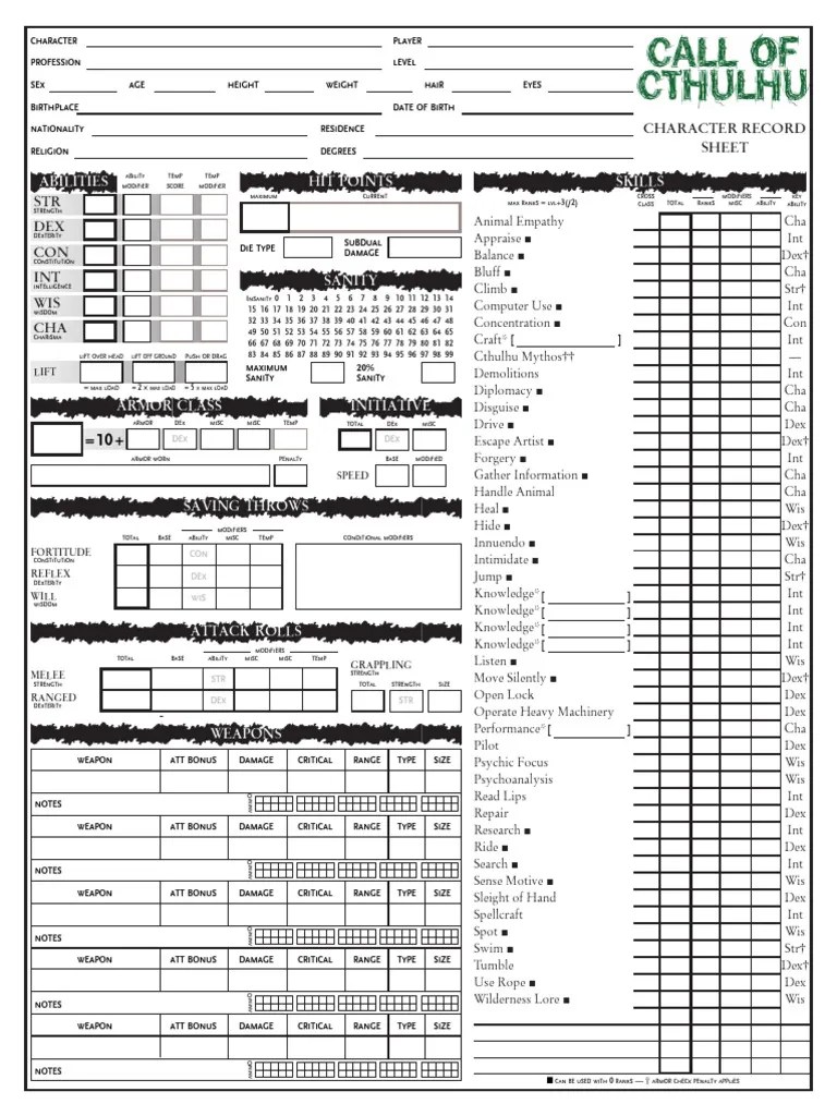 The call of cthulhu 7th edition sheet contains both the pc sheet, and a secondary mode for npc display. The character sheets are viewable in a browser, but the. Web upload an existing character. Web the following pdf characters sheets will work in a browser. For instructions on how to use them, go here. 6th edition call of cthulhu. Web the pc sheet. Under call of cthulhu menu we have the following: By default, a new character is set. Web personal description significant people eanij½ful locations treasured possessions backstor traits phobiaßb manias. Compatible with the new call of cthulhu ® 7th edition rules.