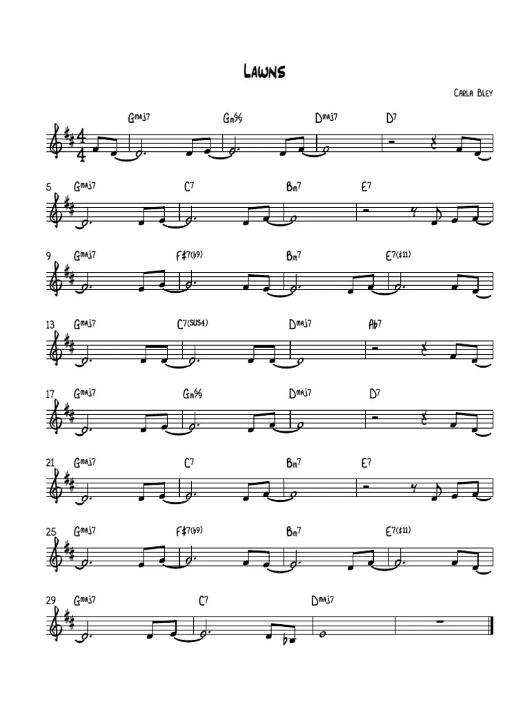 Carla Bley Lawns Sheet Music - 1 part • 1 page • 01:04 • feb 01, 2022 • 2,415 views • 6 favorites.