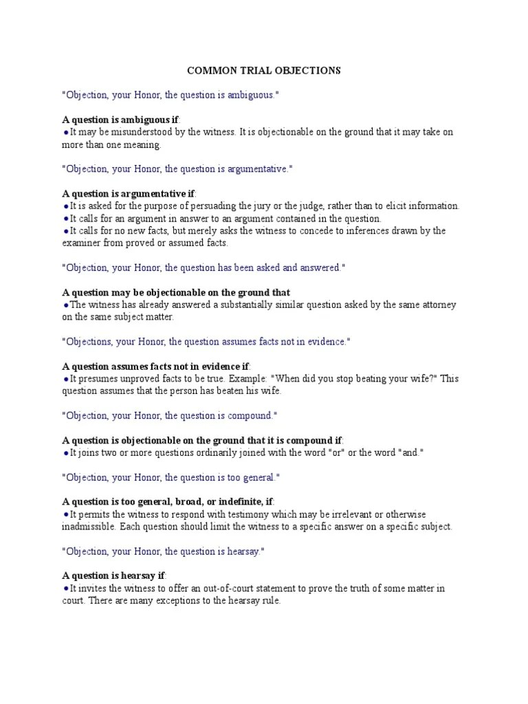 Common Trial Objections Cheat Sheet - Web a complete list of all evidentiary objections and related supports in d.c. This checklist sets out the. Web the ability to quickly object to an improper question, or respond to an objection, is an important skill. And federal law is beyond the scope of this.