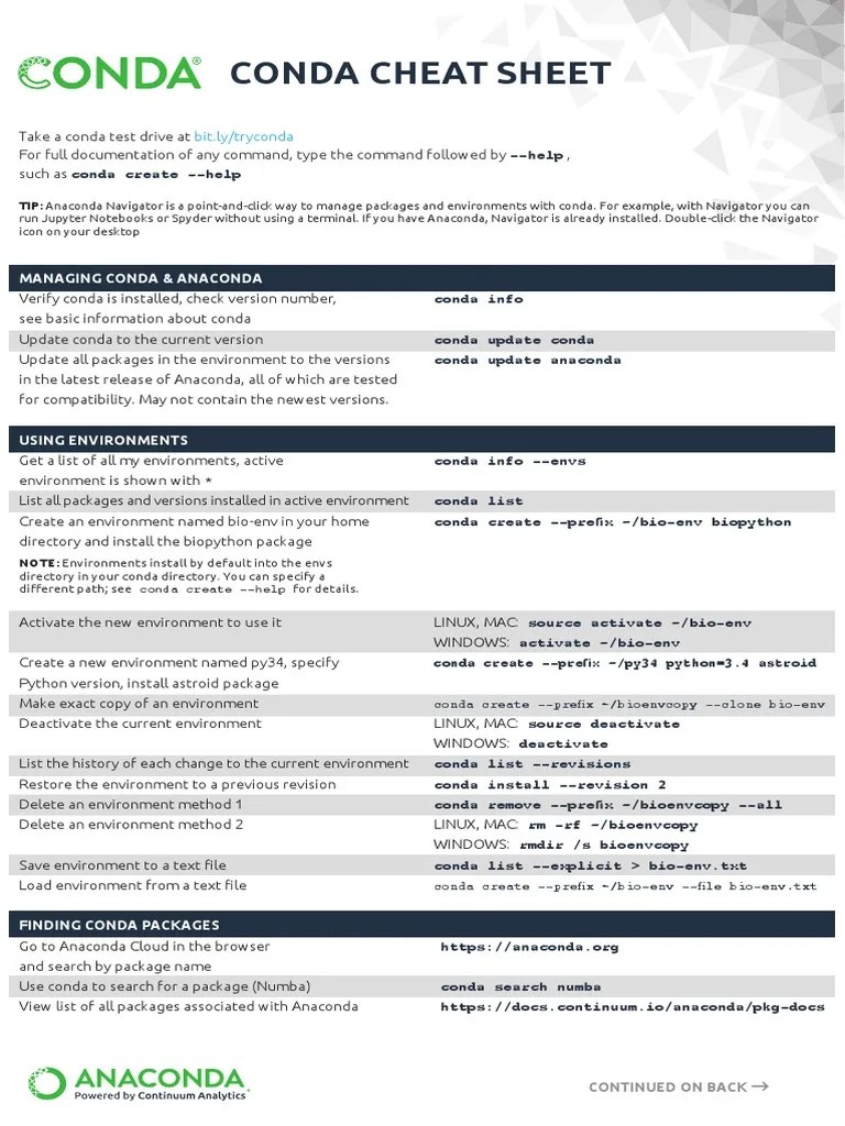 Conda Cheat Sheet - Anaconda navigator is a graphical. Web commands # conda provides many commands for managing packages and environments. Install a package from specific channel: Learn to use conda in 30 minutes at bit.ly/tryconda tip: Command line package and environment manager. The links on this page provide help for each command.