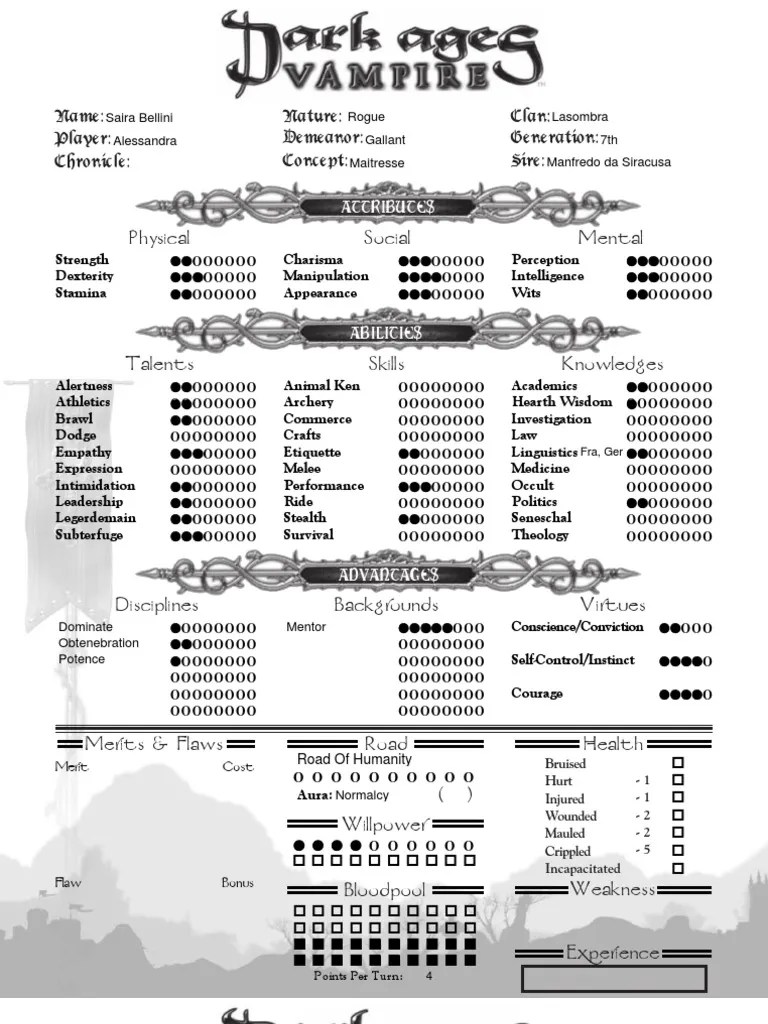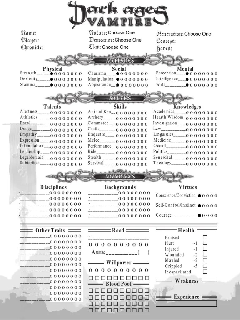 Dark Ages Vampire Character Sheet - Web dark ages vampire 20th anniversary name: Vampire the masquerade 5th ed. Web vampire the dark ages inspired design; Web hey everyone, i just realized the dark ages v20 book was out, so i uploaded the official sheets i made to my site!
