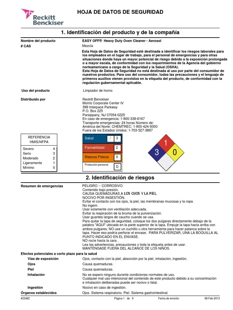 Easy Off Oven Cleaner Safety Data Sheet - Web sds # formulation # : 3101813 v1.0 relevant identified uses of the substance or mixture and uses advised. Product and company identification emergency telephone.