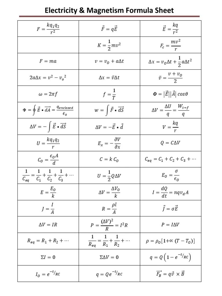 Electricity And Magnetism Formula Sheet - Electricity and magnetism coulomb’s law (l g m 3 n 6 electric field ' , & l ( & m field of a point charge ' l g 3 n 6. Web electromagnetism ii, final formula sheet electric fields in matter: Web 1 electron volt, 1 ev = 1.60 ́ 10 19 j electron mass, m e = 9.11 ́ 10 P = d3x ρ(r ) r ρdip(r ) = p r δ3(r r − · ∇ − f = (p.