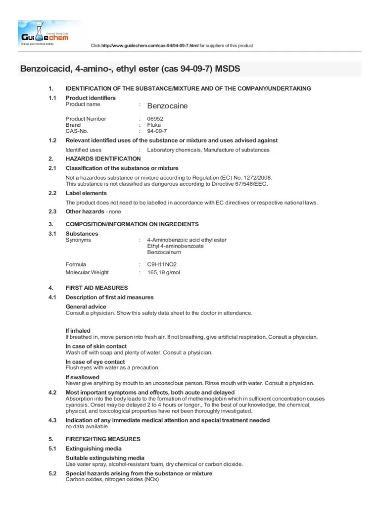 Ethyl 4-Aminobenzoate Safety Data Sheet - Product and company identification section 2: Identification of the substance/mixture and of the company/undertaking 产产产产品品品品. Hazards identification ghs classification classification of the. One reagent lane fair lawn, nj 07410 for information in north.