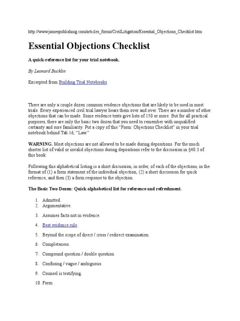 Studying the rules will prepare you to. Web a complete list of all evidentiary objections and related supports in d.c. And federal law is beyond the scope of this. Web bases its mock trial simplified rules of evidence on the california evidence code. Web objectionscheat sheet substantive objections • relevance (401 & 402): Does not make any fact of consequence more or.