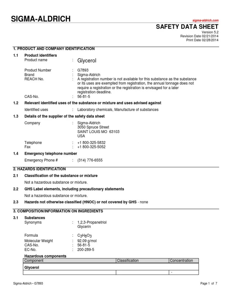 Glycerol Safety Data Sheet - Identification of the substance/mixture and of the company/undertaking product.