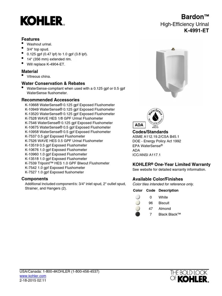 K-4991-Et Spec Sheet - 0.125 gpf (0.47 lpf) to 1.0 gpf (3.8 lpf). • 3/4 (19 mm) top spud. 14 (356 mm) extended rim. Reserves the right to make revisions without notice to product specifications. • 14 (356 mm) extended rim.