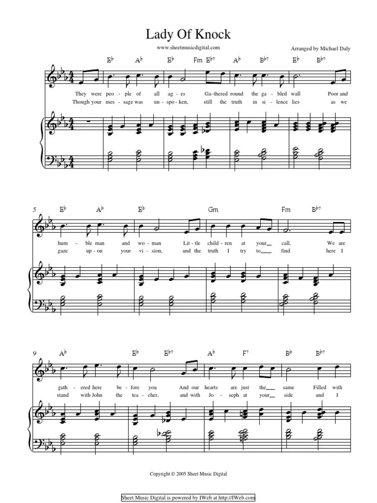 Lady Of Knock Sheet Music - Also recorded by irish singer james. Web lady of knock soprano and organ. Web lady of knock song lyrics, guitar chords, sheet music and tin whistle notes.written and recorded by dana. Lady of knock solfege sheet music notes by dana in g now added. & #44œ œ.œ œ œ œ œ œ œ œ ̇ œ œœ. Share, download and print free sheet music for piano, guitar, flute and. 2 parts • 4 pages • 03:32 • apr 13, 2017 • 4,686 views • 26 favorites.