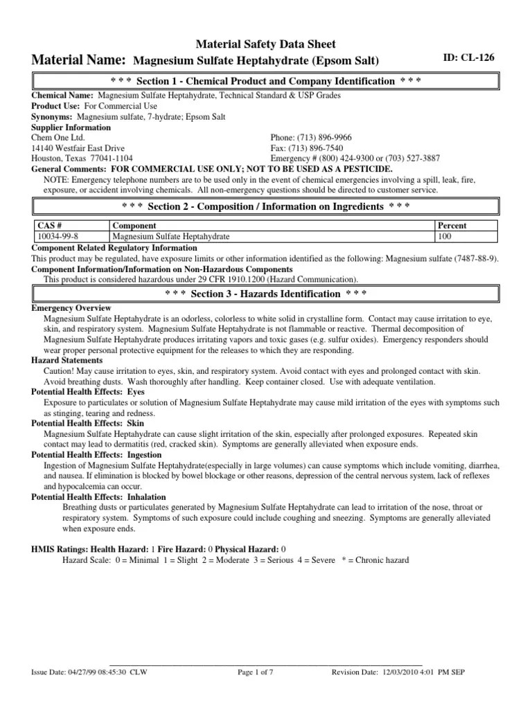 Magnesium Sulfate Safety Data Sheet - 12.17.2014 page 1 of 7 magnesium. Web 6 rows product name magnesium sulfate, anhydrous cat no. Web safety data sheet version 6.6 revision date 09/02/2021 print date 01/13/2024 section 1: Web safety data sheet according to 29cfr1910/1200 and ghs rev.