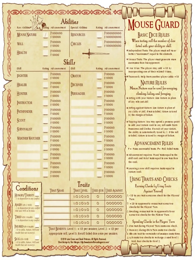 Mouse Guard Character Sheet - This download includes a map of the territories and gm sheets as well. First of all, you can download a pdf character sheet here:. So there's a couple character sheets floating. Web mouse guard rpg rules summary and character sheets. Web download the character sheet for the mouse guard rpg.