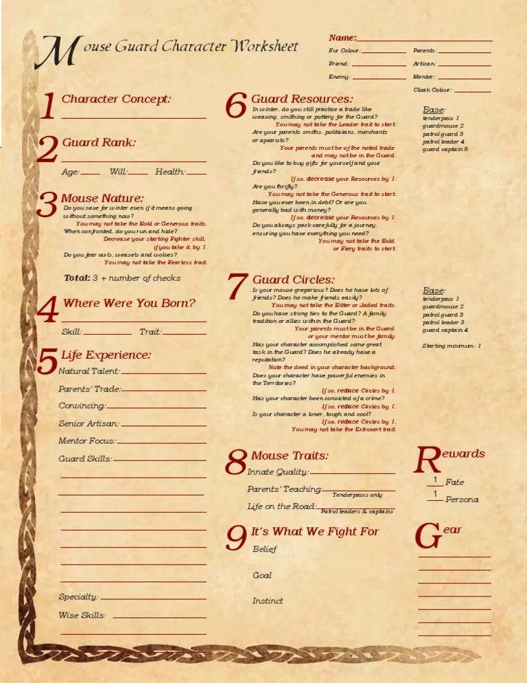 First of all, you can download a pdf character sheet here:. Web mouse guard rpg rules summary and character sheets. Web download the character sheet for the mouse guard rpg. This download includes a map of the territories and gm sheets as well. So there's a couple character sheets floating.