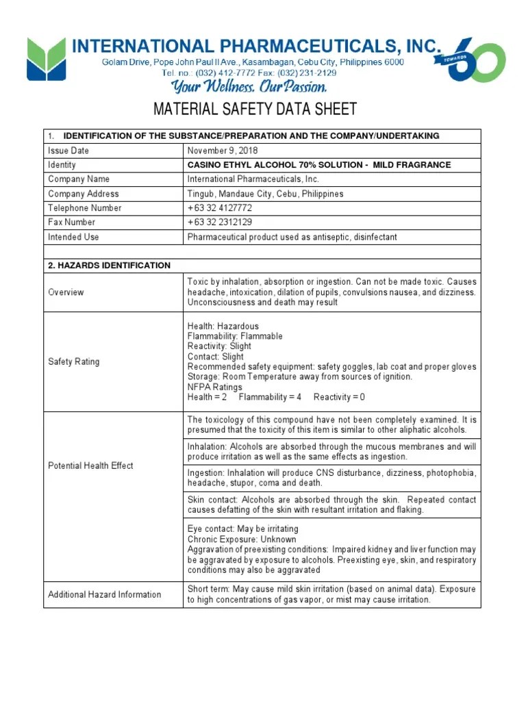 Msds Sheet For Ethyl Alcohol - Ethyl alcohol 200 proof gr acs product number : Web ethyl alcohol ec50 (72h) = 275 mg/l (chlorella vulgaris) fathead minnow (pimephales promelas) lc50 = 14200 mg/l/96h.