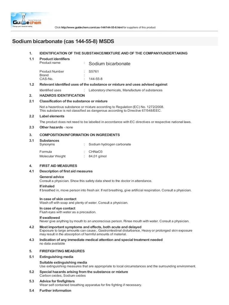 Msds Sheet For Sodium Bicarbonate - Web 3.1 substances synonyms : Sodium hydrogen carbonate formula :