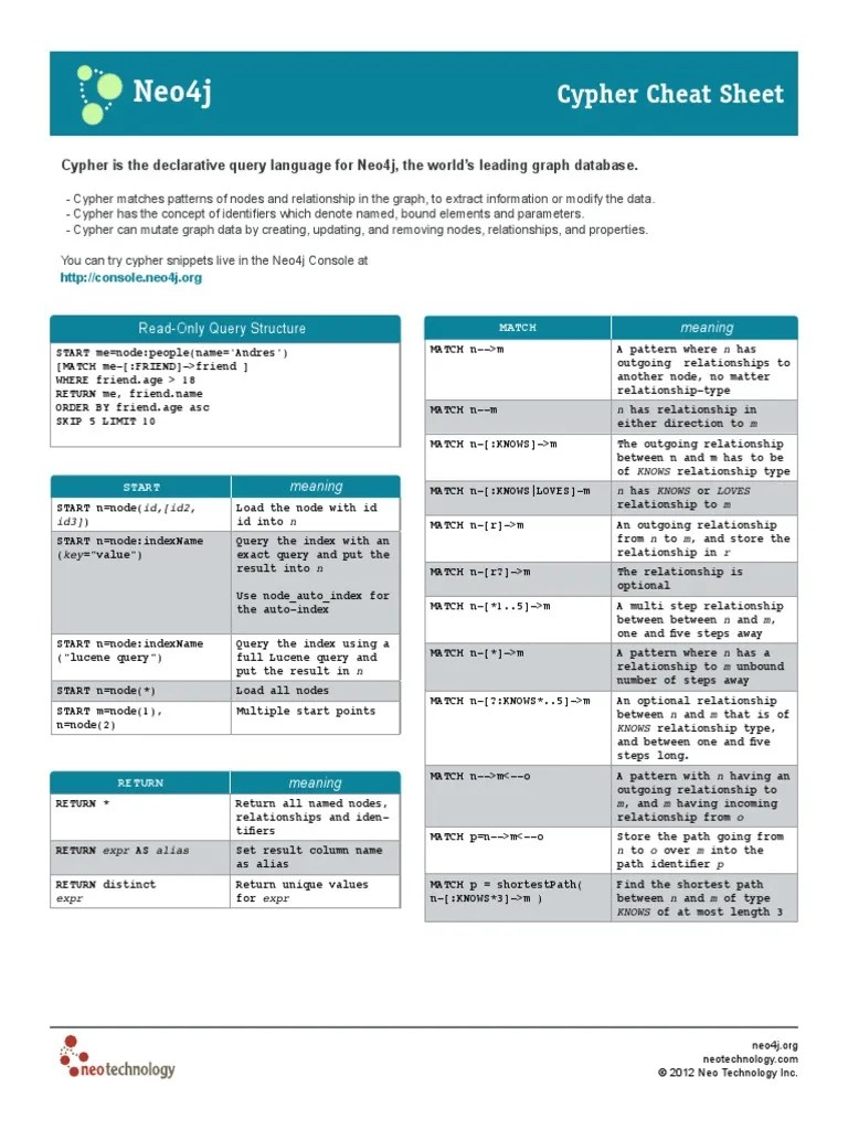 Neo4J Cheat Sheet - Web neo4j cheatsheet a neo4j cheat sheet with getting started resources and information on how to query the database with cypher. # getting started getting started with neo4j. Web neo4j only supports a subset of cypher types for storage as singleton or array properties. Web useful cypher queries for neo4j; Web neo4j users use cypher to construct expressive and efficient queries to do any kind of create, read, update, or delete (crud) on their graph, and cypher is the primary. Properties can be lists of numbers, strings, booleans, temporal, or spatial.