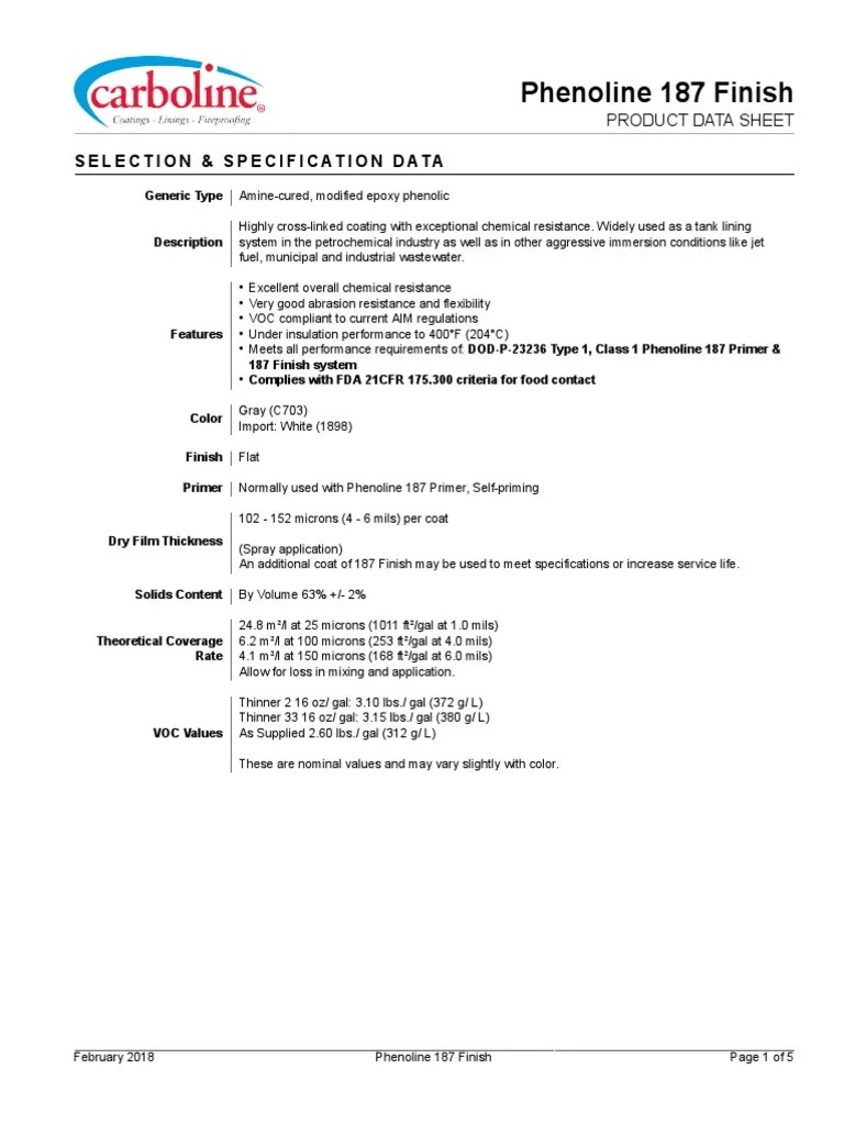 Phenoline 187 Product Data Sheet - Web phenoline 187 primer product data sheet may 2023 phenoline 187 primer page 1 of 5 selection & specification data. Primarily as a tank lining, it is. High solids epoxy lining with exceptional chemical resistance.