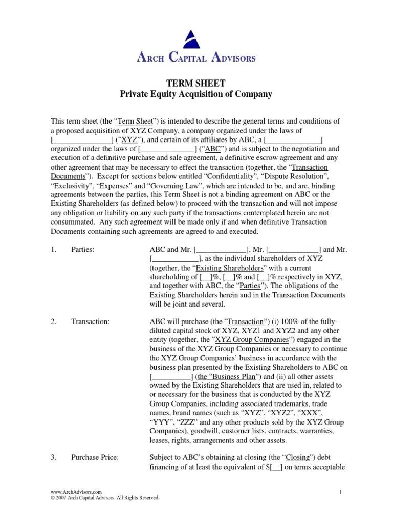 Private Equity Term Sheet - Web a term sheet is a document commonly used in venture capital and private equity investing to outline the terms of an investment agreement between a company, investor, or syndicate of investors. Web the summary of terms (also known as a term sheet) specifies the rights and other terms of an. Whether the initial agreement as to terms is structured as a “term sheet” or a “letter of intent” is a technical difference, and the. Whether the initial agreement as to terms is structured as a “term sheet” or a “letter of intent” is a technical difference, and the. Web a term sheet is a nonbinding agreement that shows the basic terms and conditions of an investment. Web the “term sheet” or “letter of intent” is a key document in a venture capital transaction. The term sheet serves as a template and basis for more detailed, legally binding documents. Web the “term sheet” or “letter of intent” is a key document in a venture capital transaction.