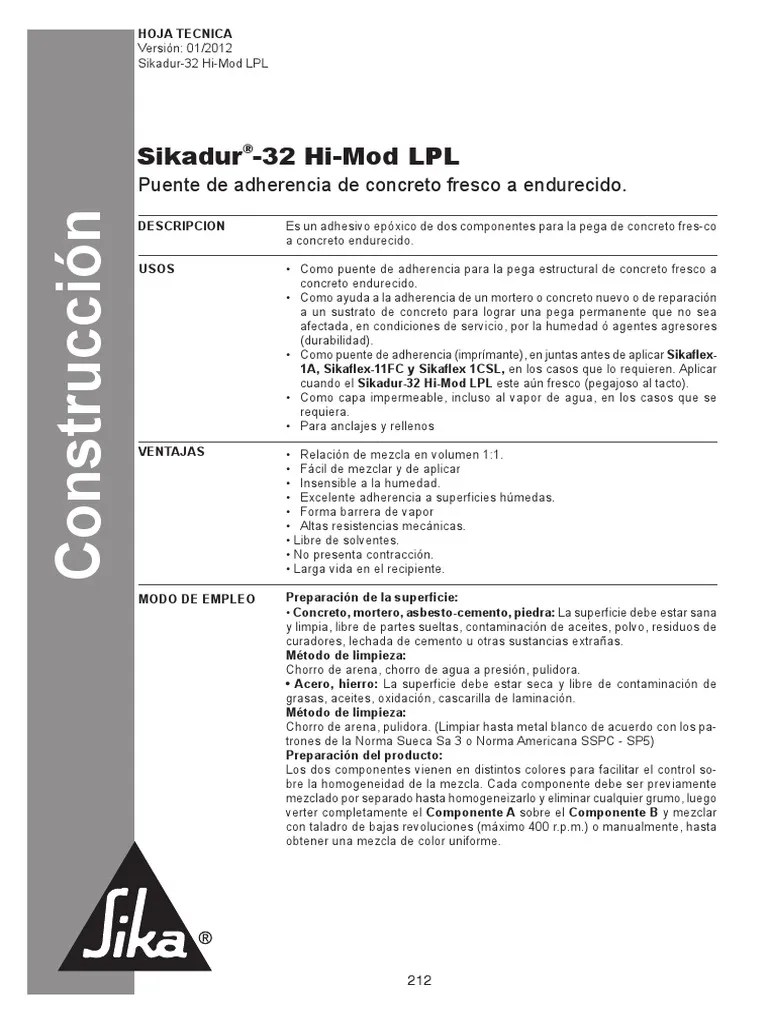 Sikadur 32 Hi-Mod Data Sheet - Suitable for use in hot and tropical climatic conditions. It conforms to the current.