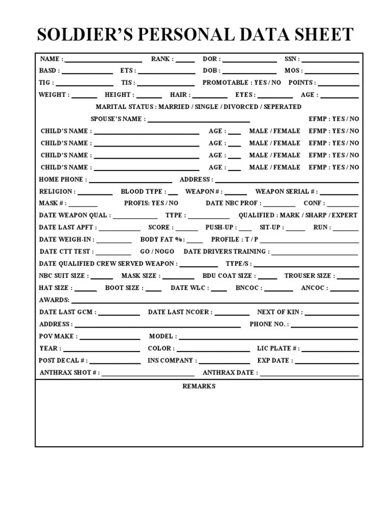 Soldiers Personal Data Sheet - Web we would like to show you a description here but the site won’t allow us. Privacy act of 1974 compliance information. Web the soldier’s personal data sheet was submitted by sgt shane puffer and allows you to fill in the fields on the pdf form to print in a nice clean format. The following information is provided in accordance with 5 u.s.c. This includes hundreds of data elements regarding knowledge, skills,. Web the usg routinely intercepts and monitors communications on this is for purposes including, but not limited to, penetration testing, comsec monitoring, network. Web soldier's personal data sheet. Web the stp provides a detailed level of workplace characteristics on each soldier in our force.