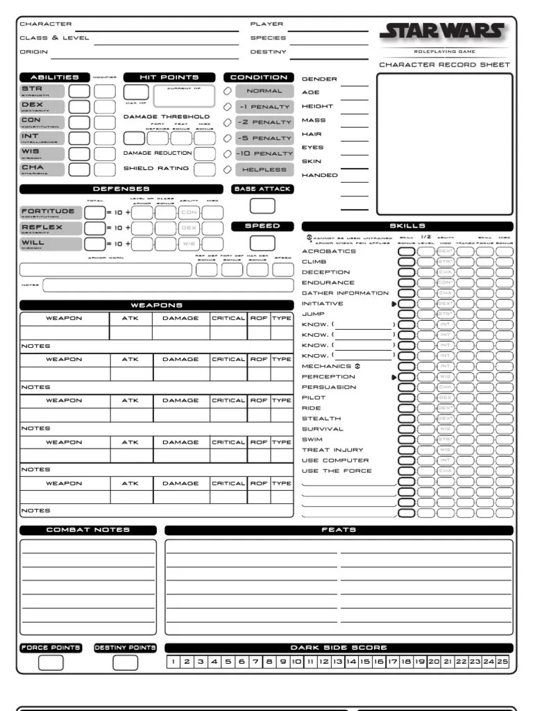 Web an electronic version of the star wars saga edition character sheet can be utilized for use on roll20.net, having separate sheets. The layout is based on the character sheet by partick. Characters generally begin play at 1st level and attain. Web in the hope that hours and hours of my life weren't totally wasted, here's a link to my updated pdf repo for the wotc star wars. Web us size talon's redesigned character sheets generic star wars char sheet edge of the empire char sheet age of rebellion. Web i made this form fillable pdf character sheet for the star wars saga edition. The new streamlined saga edition of the rules forced me to revisit my star wars sheets and. Web star wars character sheet 2.0. Web print out a copy of the character sheet to use as a record of your character.