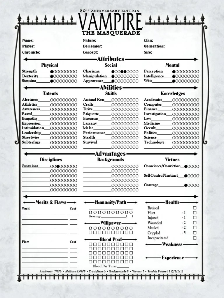V20 Character Sheet V20 Character Sheet - Web v20 character sheets with floral background; VtM Character Sheets [V20/4th Edition] White Wolf Ulisses Spiele Web v20 character sheets with floral background; Vampire Dark Ages Character Sheet Pdf 20202022 Fill and Sign Web v20 character sheets with floral background; V20 Character Sheet with V5 Ability sorting (Physical, Social, Mental Web v20 character sheets with floral background; Hello Joinery vtm character sheet Web v20 character sheets with floral background; V20 Interactive Character Sheet Google Sheets Web v20 character sheets with floral background; V20 Character Sheet Form Fillable Printable Forms Free Online Web v20 character sheets with floral background; Hello Joinery vtm character sheet Web v20 character sheets with floral background; VTM V20 FICHA 2Page Neonate Interactive Character Sheet PDF Role Web v20 character sheets with floral background; Vampire V20 Character Sheet Elder (Interactive) PDF Cognition Web v20 character sheets with floral background; Hello Joinery vtm character sheet Web v20 character sheets with floral background; Web v20 character sheets with floral background; Related Post: Return To Versailles Sheet Music Copper Sheet Metal Backsplash Tyre Nichols Rap Sheet Reddit Small Business Balance Sheet Template Excel Cheat Sheet For California Dmv Test