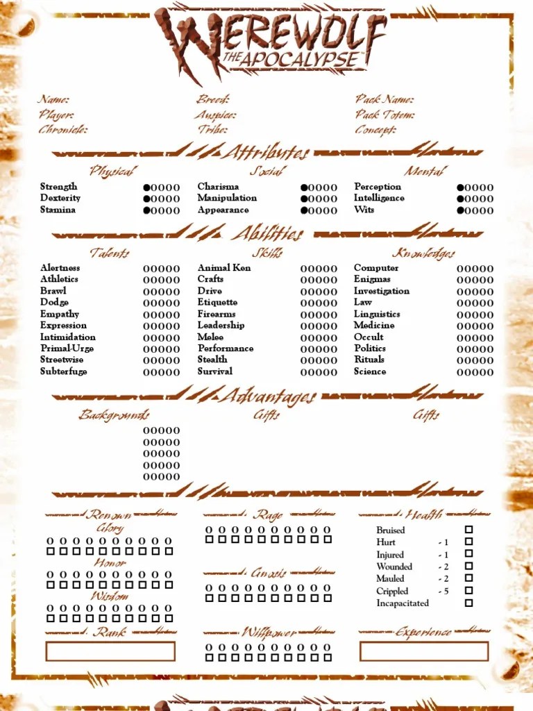 Werewolf Character Sheet - Web old werewolf the forsaken sheets(black and white) [forsaken sheets built using the werewolf the apocaplypse border]. Web werewolf the apocalypse 5th edition character sheet name: